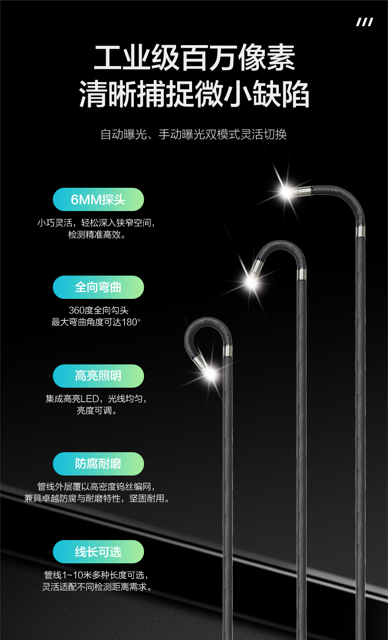 GM系列手持工業(yè)內(nèi)窺鏡采用7寸IPS全視角工業(yè)高清液晶觸摸屏和6mm(管線鏡頭直徑可選)360°旋轉(zhuǎn)鏡頭,電動(dòng)控制搖桿, 操控感良好、小巧靈活。主要用于檢查小直徑的工業(yè)管路或復(fù)雜狹小的設(shè)備內(nèi)部空間,對(duì)腐蝕、裂紋、焊縫、異物、磨損以及零部件內(nèi)部的加工等情況進(jìn)行細(xì)致全面的檢測(cè)。