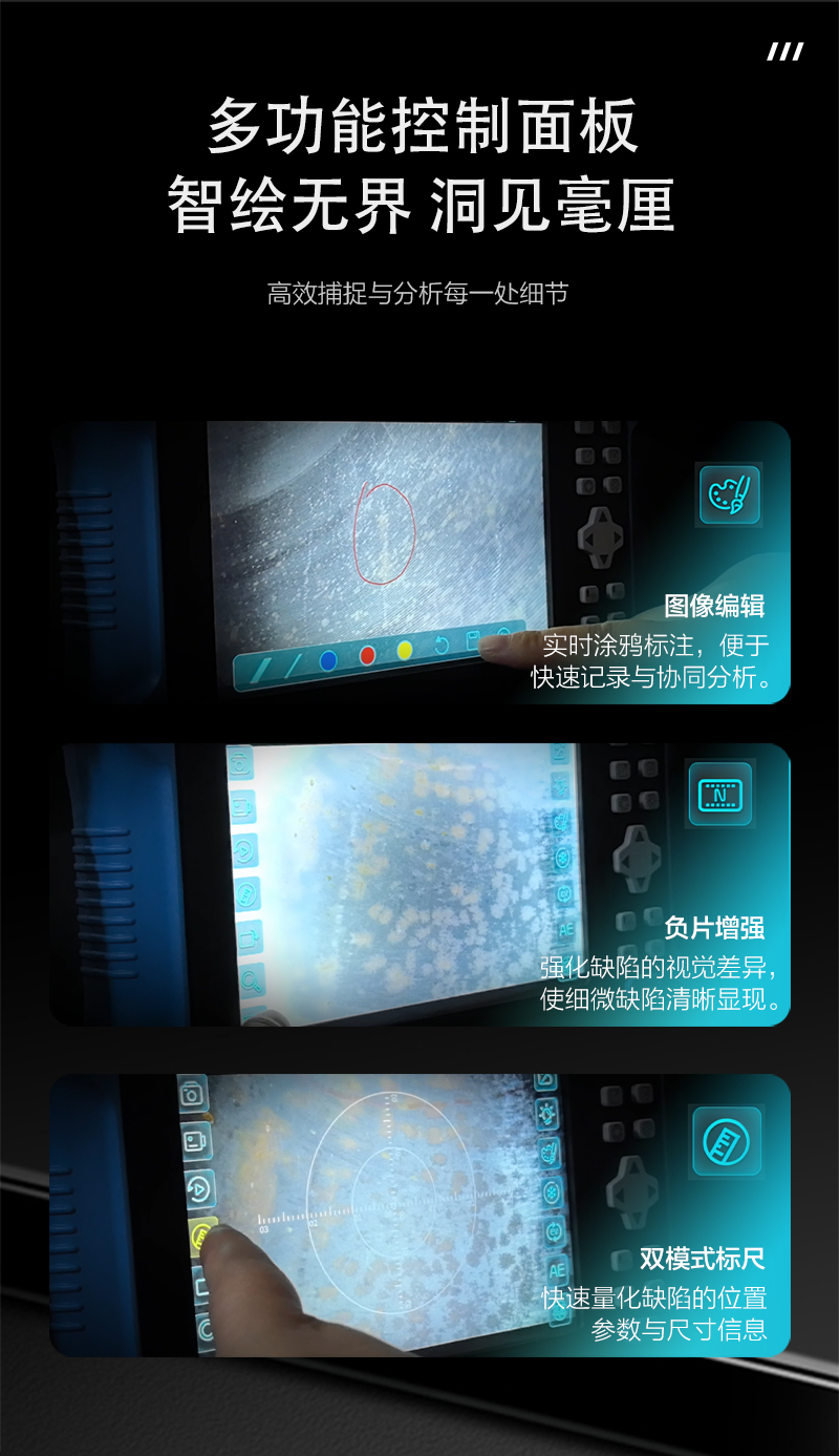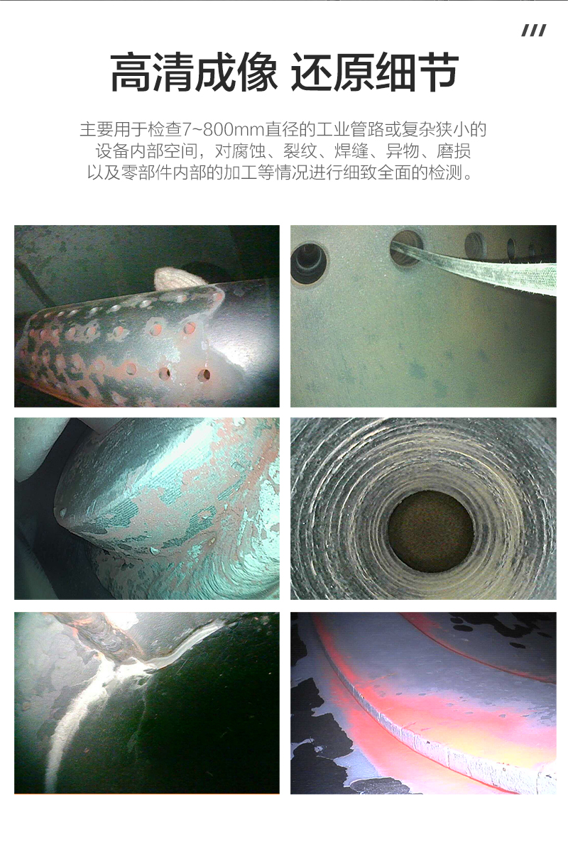 產(chǎn)品概述: GM系列手持工業(yè)內(nèi)窺鏡采用7寸IPS全視角工業(yè)高清液晶觸摸屏和6mm(管線鏡頭直徑可選)360旋轉(zhuǎn)鏡頭,電動(dòng)控制搖桿, 操控感良好、小巧靈活。主要用于檢查小直徑的工業(yè)管路或復(fù)雜狹小的設(shè)備內(nèi)部空間,對(duì)腐蝕、裂紋、焊縫、…